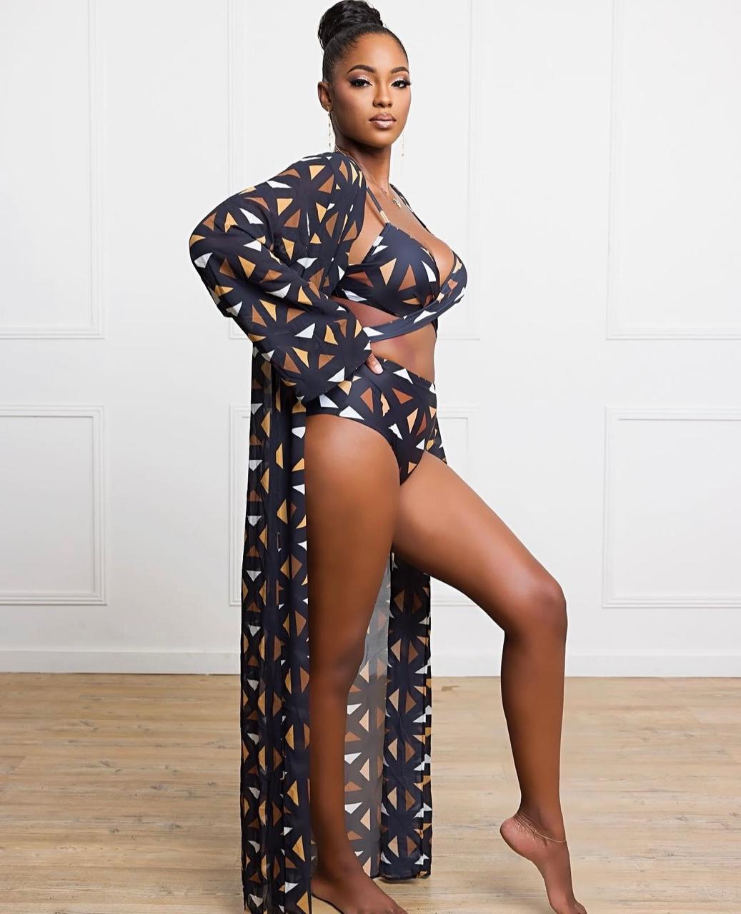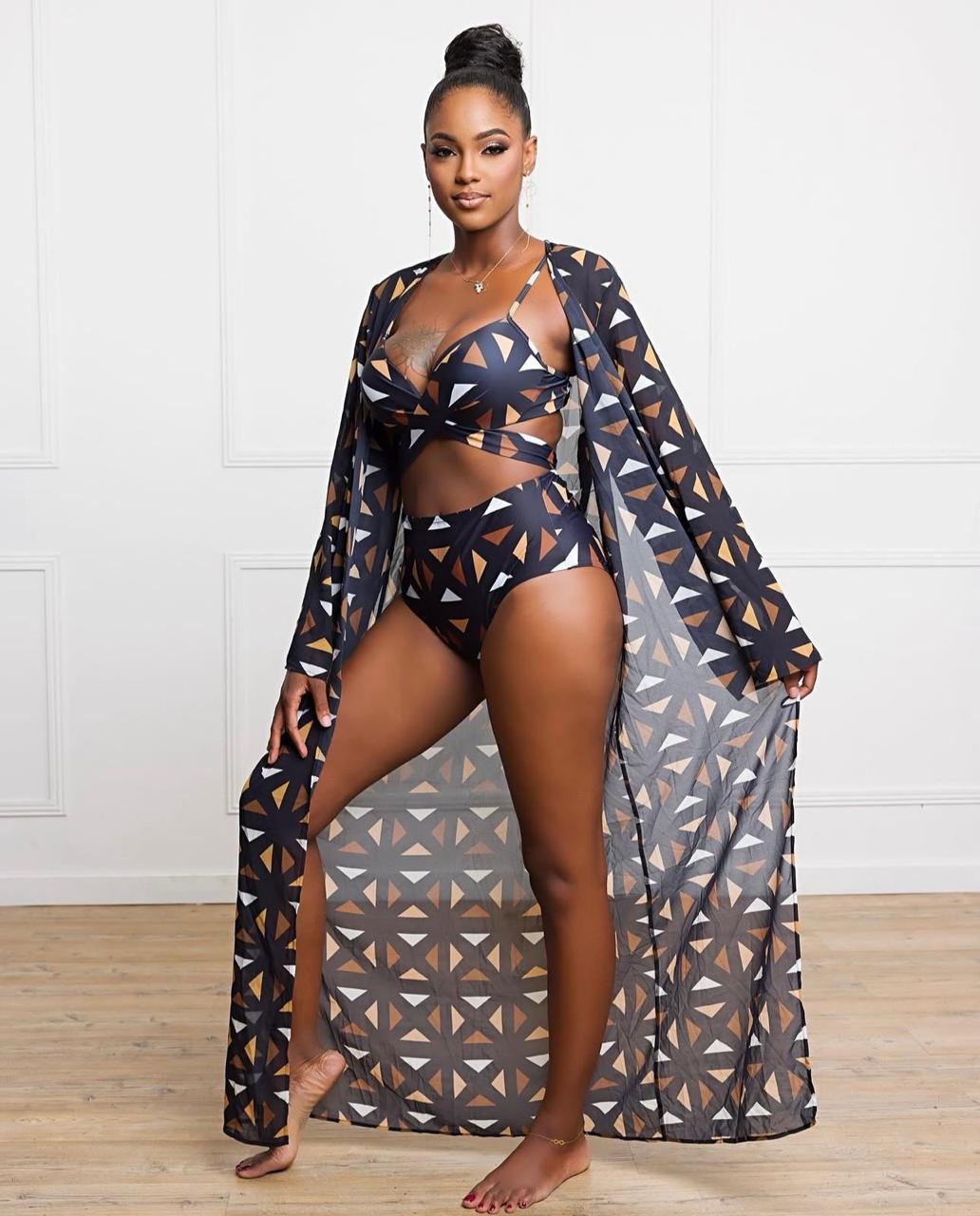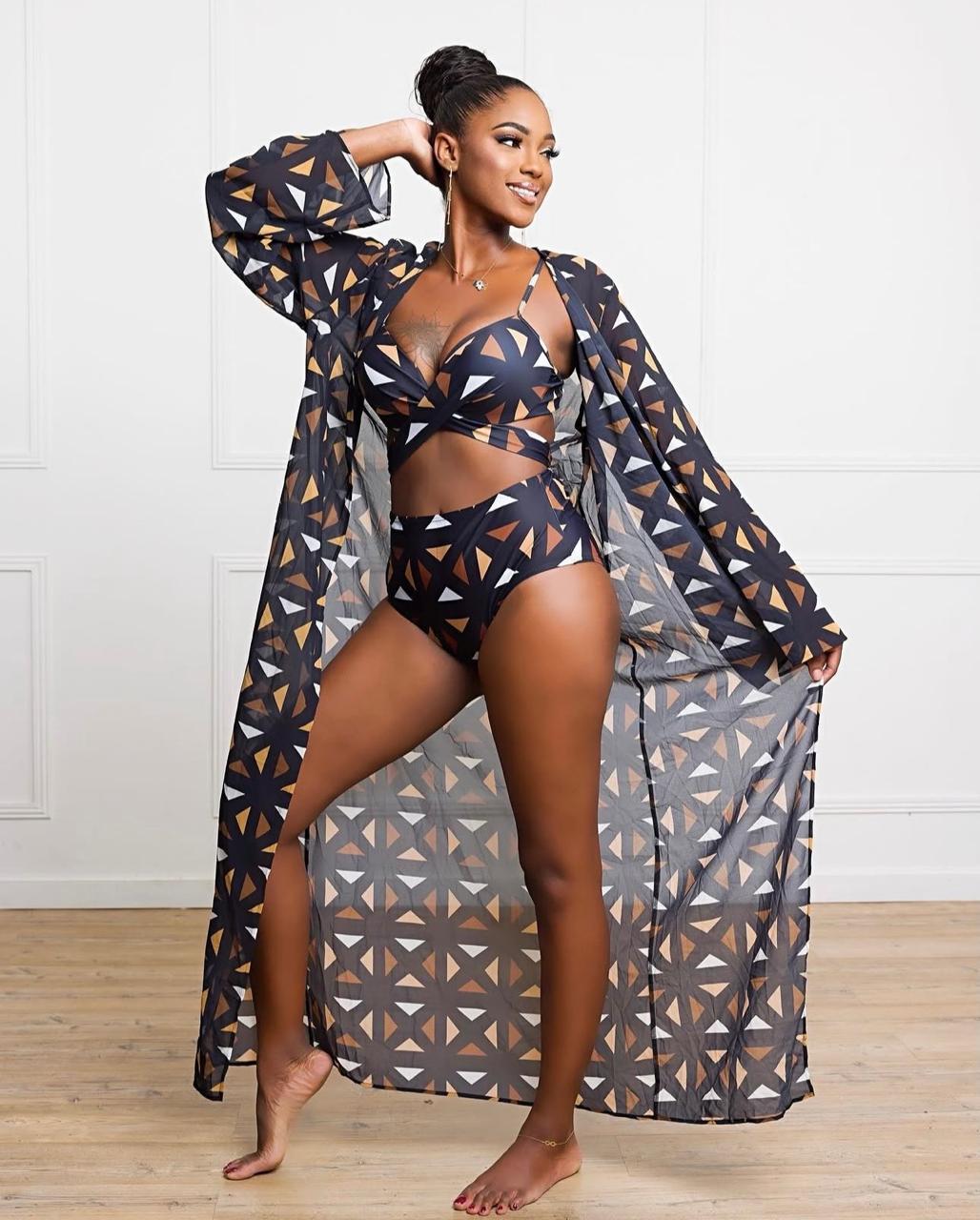 - Ensemble 3 pièces : haut de bikini, culotte taille haute et kimono long